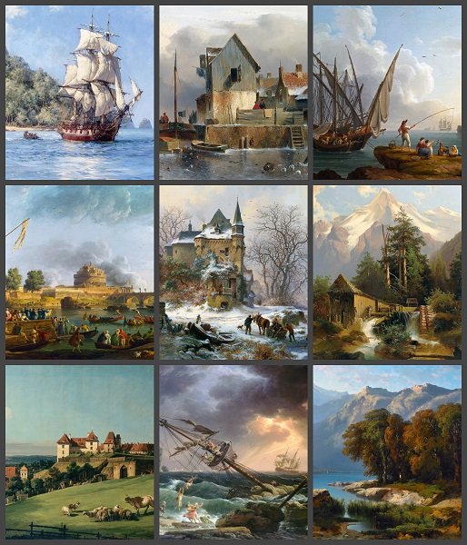 Представлены репродукции 100 картин французского живописца Клода Жозефа Верне, итальянского художника, мастера городского пейзажа - Бернардо Беллотто, типичного представителя классицизма немецкого живописца Якоба Филиппа Хаккерта (Гаккерта) и других выдающихся пейзажистов своего времени. Репродукции адаптированы под разрешение 1920х1080 без искажения оригинальных пропорций с незначительной потерей части изображения.